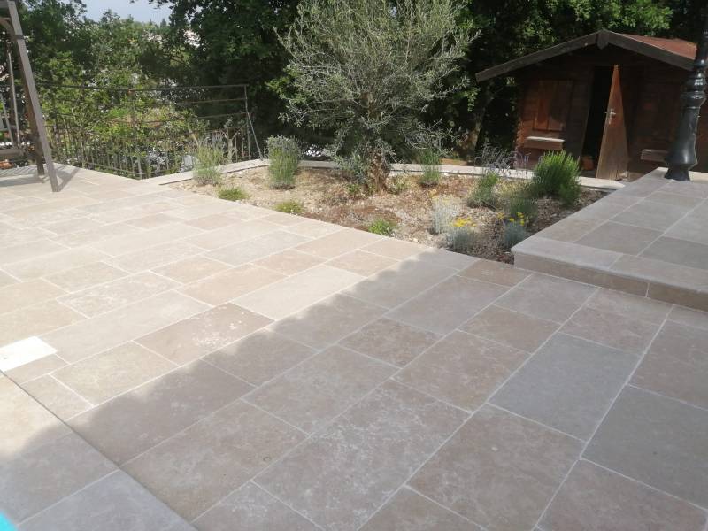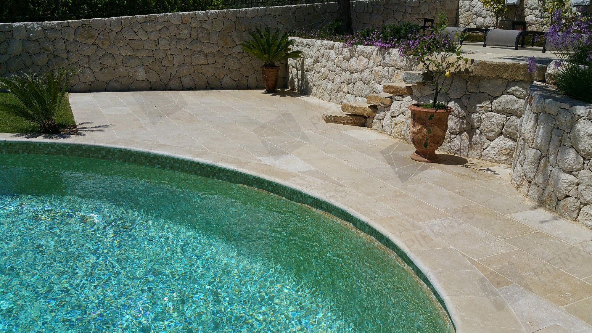 Le nettoyage de cette pierre est aisé, mais il doit respecter certaines règles. Débarrassez régulièrement le dallage de ses poussières pour éviter l’accumulation de dépôts. Pour un nettoyage plus approfondi, il n’est pas recommandé d’utiliser des produits acides ou agressifs pour le calcaire. Azur Pierres propose une gamme de produits spécifiquement adaptés à ce type de pierre naturelle, afin de préserver la qualité et la longévité de votre dallage.