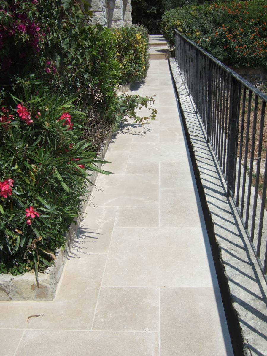 La finition vieillie du Château Villebois offre une surface irrégulière, adoucie par le temps, qui imite l’usure naturelle de la pierre. Cet aspect patiné confère au dallage un charme d’antan, parfait pour les maisons de caractère, les bastides provençales ou les aménagements au style traditionnel.