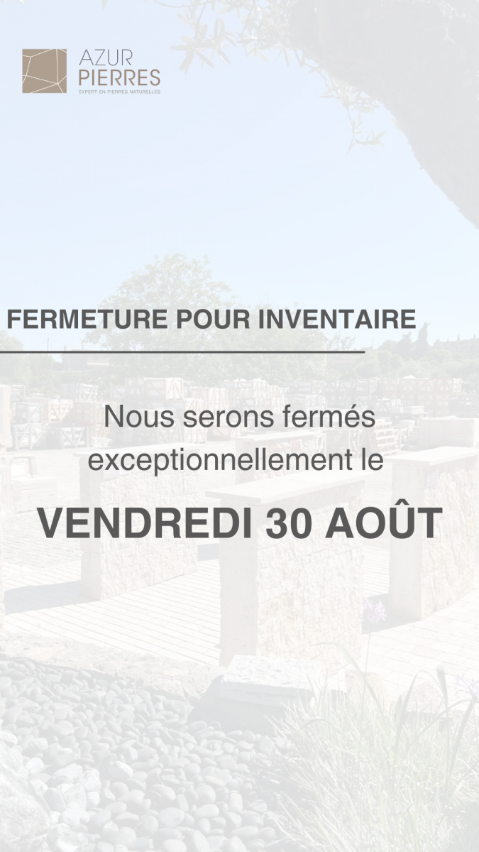 Nous vous informons qu’Azur Pierres sera exceptionnellement fermée le vendredi 30 août 2024 pour procéder à notre inventaire annuel.