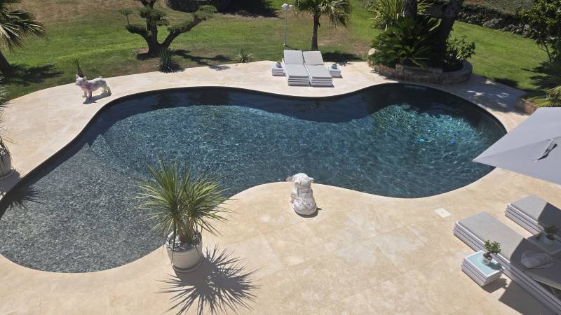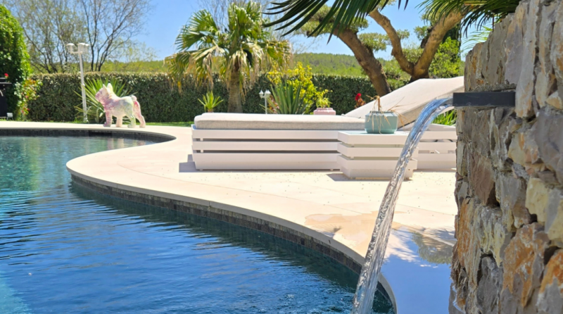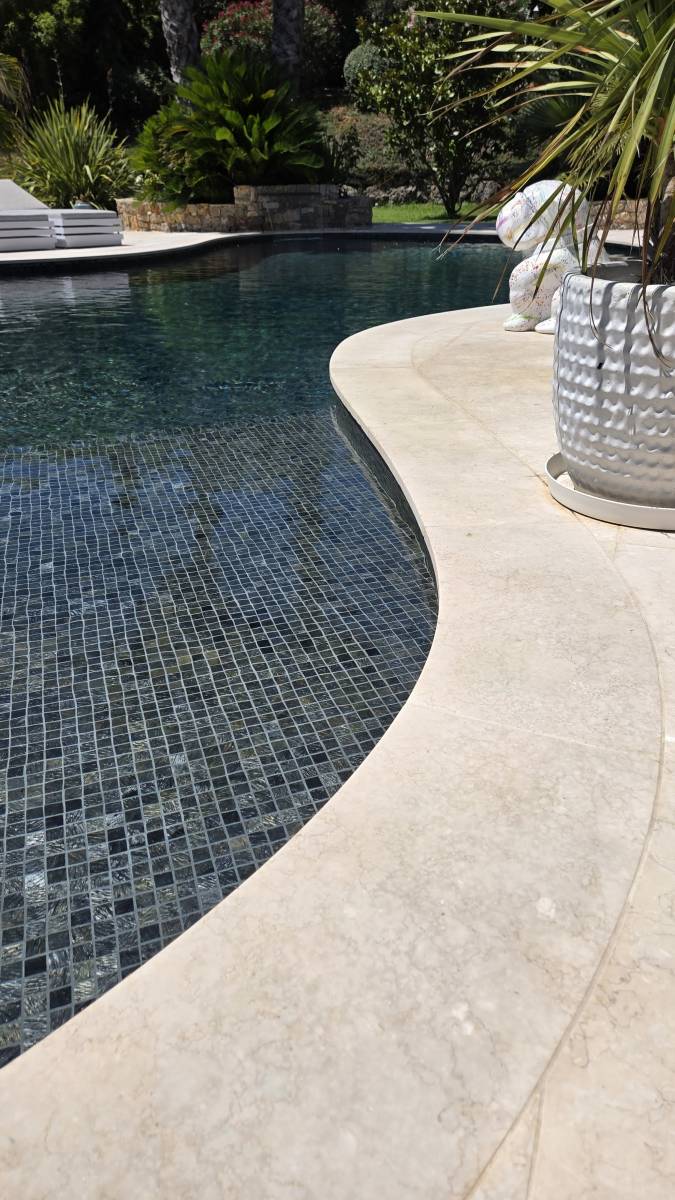 Les plages de piscine ont été réalisées en dallage Crema Light, finition sablée brossée, en format 80 × 80 cm, offrant confort, sécurité et luminosité aux abords du bassin. Afin d’assurer une parfaite cohérence esthétique, des margelles de piscine courbes sur mesure ont été spécialement façonnées dans la même pierre et la même finition que le dallage. Ce travail sur mesure permet une continuité visuelle harmonieuse entre les plages et le bassin, tout en accompagnant avec précision les lignes organiques de la piscine.