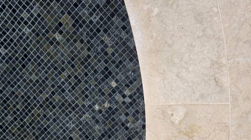 Le bassin est habillé d’une mosaïque en Quartzite de Bali, pierre naturelle reconnue pour sa résistance et son rendu minéral unique. Ses nuances profondes de gris et de bleu apportent une véritable profondeur à l’eau et soulignent le caractère élégant et contemporain de la piscine.