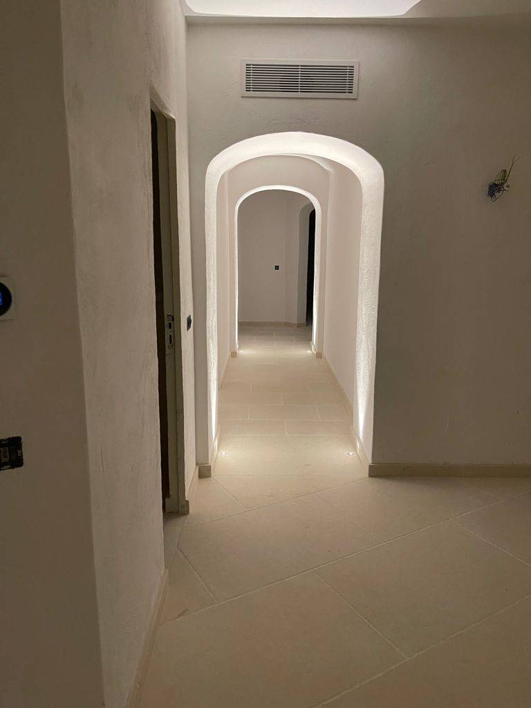 Le dallage en pierre naturelle Crema Light, choisi pour sa teinte douce et lumineuse, joue un rôle central dans cette cohérence visuelle. Sa finition sablée brossée recouvre aussi bien les espaces intérieurs que les terrasses extérieures, assurant une continuité fluide entre les différents espaces de vie. Ce choix stratégique permet de créer une atmosphère homogène, où l’intérieur et l’extérieur se fondent parfaitement, tout en apportant une touche de raffinement et de simplicité.