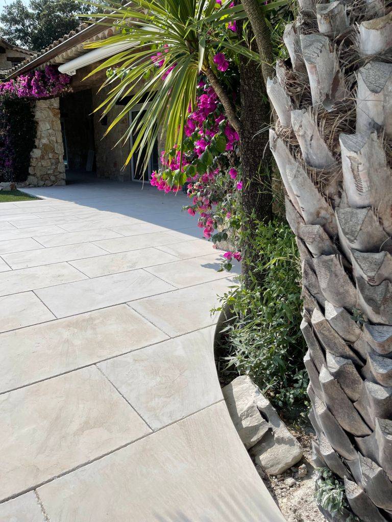 Ce projet est une véritable œuvre sur-mesure, où chaque élément a été conçu pour s’unir et créer un ensemble cohérent. Le dallage, l’escalier et les margelles de piscine ne sont que quelques exemples de l’attention portée à chaque détail pour garantir un résultat final exceptionnel, alliant luxe, confort et authenticité.